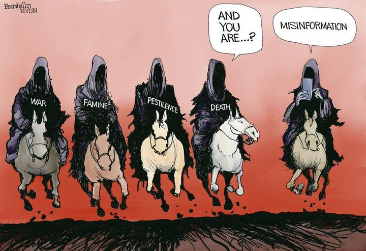 If you were to poll people today about the greatest challenge facing not just this country but humanity itself, the list of logical candidates that come immediately to mind might include the pandemic (duh!), the climate crisis (another no-brainer), and the authoritarian threats to democracy (including numerous state republican legislatures here at home). However, I would argue that an even greater challenge we face today is misinformation (and its manipulative cousin, disinformation), and I am not alone in this conviction. The World Health Organization has actually called the attack on empirical truth today in various media and on-line venues an “infodemic,” and in one of my favorite political cartoons of the past year (for which I can only provide a link due to copyright), Bill Bramhill of the New York Daily News has the traditional Four Horsemen—War, Famine, Pestilence, & Death—joined by a fifth called “Misinformation,” riding right along beside them, head buried in a cellphone.